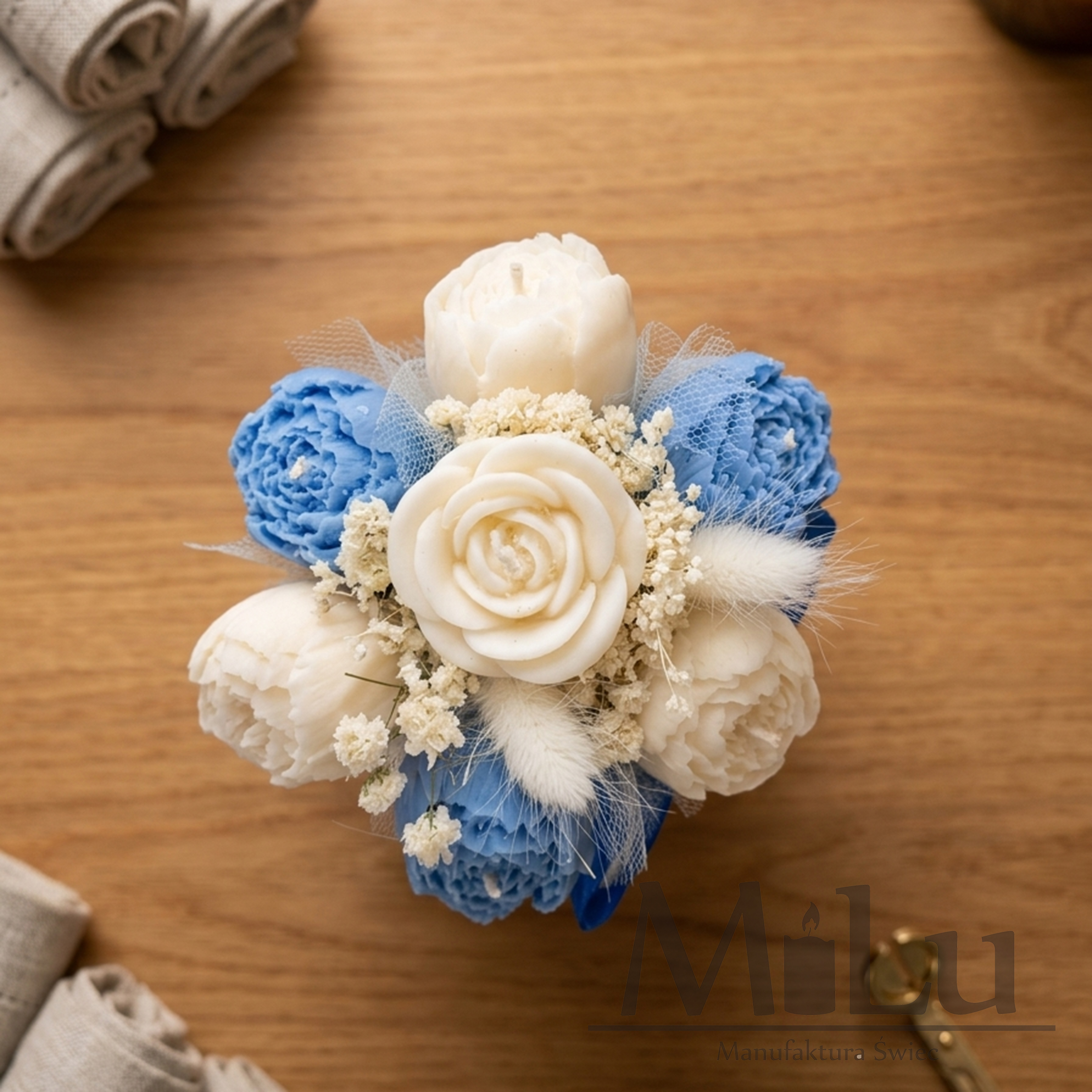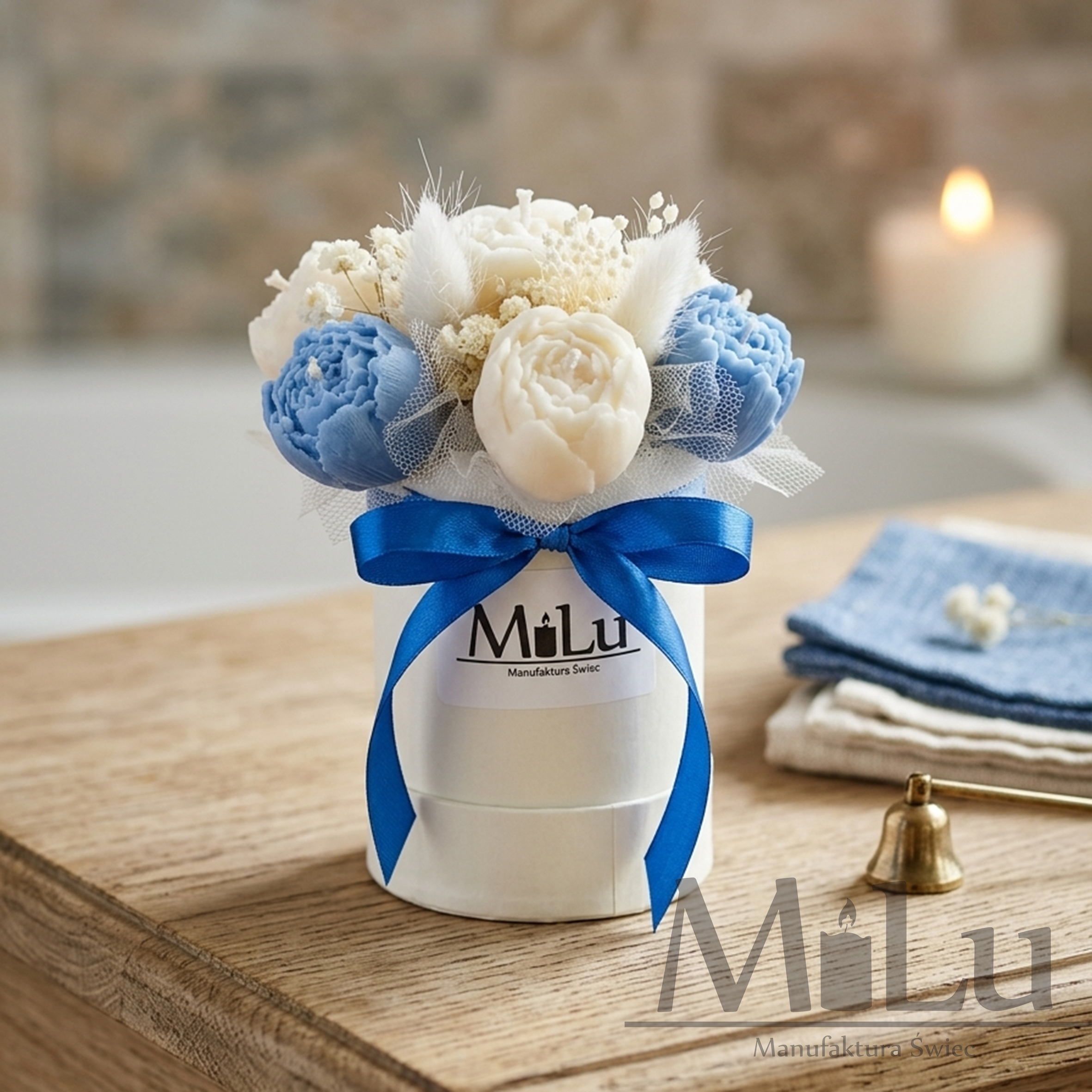 Chabrowa Symfonia Spokoju to niezwykle estetyczne połączenie rzemieślniczej pasji i miłości do natury. Ten mini-box to miniaturowe dzieło sztuki, w którym główną rolę odgrywają sojowe kwiaty w odcieniach czystej bieli i wyrazistego, polnego chabru. To kompozycja, która przywodzi na myśl letnie popołudnie na kwitnącej łące, zamknięta w eleganckiej, nowoczesnej formie.